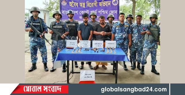 অবৈধ অস্ত্র উদ্ধার অভিযানের অংশ হিসেবে মোংলা কোস্টগার্ড পশ্চিম জোনের একটি আভিযানিক দল অভিযানে দুই সন্ত্রাসীকে আটক করা হয়েছে।বৃহস্পিতবার দুপুরে গোপন সংবাদের ভিত্তিতে খেঁজুরতলা ঘাট এলাকা থেকে তাদের আটক করা হয়। এসময় তাদের কাছ থেকে বিপুল পরিমান দেশীয় অস্ত্র, হাত বোমা ও বিদেশী পিস্তুল উদ্ধার করা হয়েছে।