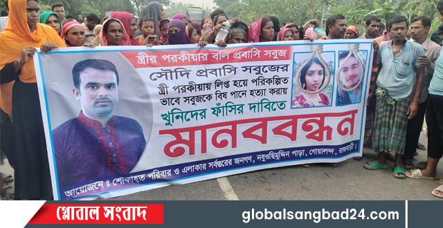 রাজবাড়ীর গোয়ালন্দে সৌদি আরব প্রবাসী যুবক সবুজ শেখের (৩৫) হত্যাকারীদের বিরুদ্ধে থানায় মামলা গ্রহন, মূলহোতা স্ত্রী রোকসান (২৫) ও তার পরকীয়া প্রেমিককে দ্রুত গ্রেফতার করে ফাঁসির দাবিতে মানববন্ধন, বিক্ষোভ ও মহাসড়ক অবরোধ করে বিক্ষুব্ধ এলাকাবাসী ও নিহতের স্বজনরা।