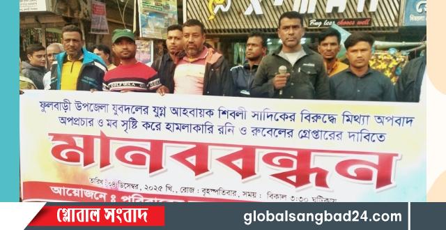 মানববন্ধনে ফুলবাড়ী উপজেলা যুবদলের যুগ্ম আহ্বায়ক শিবলী সাদিক বলেন গত সোমবার ফুলবাড়ী উপজেলার ২নং আলাদীপুর ইউনিয়নের বিজিবি ক্যাম্প ডাঙ্গাপাড়া এলাকায় ঈদগাহ্ মাঠের পার্শ্বে আমার ও আমার ভাইয়ের ক্রয়কৃত জায়গায় মাটি ভরাটের সময় পরিকল্পিতভাবে রাজনৈতিক ইস্যু করে ধর্মীয় অনুভূতিকে কাজে লাগিয়ে বিজিবি ক্যাম্প ডাঙ্গা পাড়া গ্রামের রনি ও তাঁর ভাই রুবেল আমার উপর অতর্কিত হামলা চালায় এবং এ ঘটনায় এলাকাবাসীকে ঈদগাহ্ মাঠের মাটি কেটে আমার জায়গায় দিচ্ছি উস্কিয়ে দিয়ে মহাসড়ক অবরোধ করে আমার বিরুদ্ধে বিভিন্ন সংবাদ মাধ্যমে মিথ্যা অপবাদ ও অপপ্রচার চালানো হয়েছে যাহা সম্পুর্ন ভিত্তিহীন ও বানোয়াট।