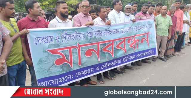রাজবাড়ীর গোয়ালন্দ উপজেলার দৌলতদিয়া ও দেবগ্রাম ইউনিয়নের পদ্মা নদীর ভাঙ্গন প্রতিরোধে মানববন্ধন কর্মসূচি পালিত হয়েছে।