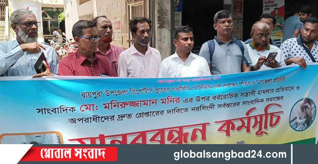 নরসিংদীর রায়পুরায় মনিরুজ্জামান মনির (৪০) নামে স্থানীয় এক সাংবাদিককে গুলি করে ও হাতুড়ি দিয়ে পিটিয়ে গুরুতর আহত করেছে দুর্বৃত্তরা। এর বিচার চেয়ে বুধবার (১৪ আগস্ট) দুপুরে মানববন্ধন করেছে নরসিংদীর সর্বস্তরের সাংবাদিকবৃন্দ।