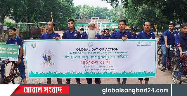 গ্লো বাল ডে অফ এ্যাকশন-২০২৫ উপলক্ষে ঋণ বাতিল করে জলবায়ু অর্থায়নের দাবিতে সাইকেল র্যালি অনুষ্ঠিত হয়েছে। শনিবার (২৮ জুন) সকালে সাতক্ষীরা শহীদ আব্দুর রাজ্জাক পার্কে ধরিত্রী রক্ষায় আমরা (ধরা) ও ওয়াটার কিপারস বাংলাদেশের সহযোগিতায় সুন্দরবন ফাউন্ডেশনের আয়োজনে ঋণ বাতিল করো,কয়লা বিদ্যুৎ বন্ধ করো অর্থায়ন নিশ্চিত কর, ধনীদের জন্য কর গরিবের জন্য নয় বিভিন্ন দাবি লেখা সম্বলিত ব্যানার ও প্লাকার্ড সহকারে শহীদ আব্দুর রাজ্জাক হতে একটি বর্ণাঢ্য সাইকেল র্যালি বের হয়। র্যালিটি শহরের গুরুত্বপূর্ণ সড়ক প্রদক্ষিণ শেষে আবারও শহীদ রাজ্জাক পার্কে গিয়ে শেষ হয়।