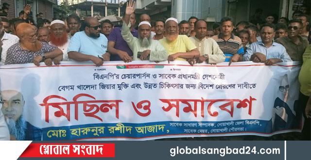 বিএনপির চেয়ারপার্সন বেগম খালেদা জিয়াকে উন্নত চিকিৎসার জন্য বিদেশ ফেরন এবং বিএনপির কেন্দ্রীয় ভাইস চেয়ারম্যান ও নোয়াখালী ৪ আসনের সাবেক সংসদ সদস্য শাহজাহানসহ ১৫ জনের বিরুদ্ধে আট বছর আগে রাজধানীর ভাটার থানায় দায়ের করা পুলিশের নাশকতার মামলায় চার বছরের কারদন্ডের প্রতিবাদে কেন্দ্রীয় কর্মসূচির অংশ হিসেবে নোয়াখালীতে বিক্ষোভ মিছিল করেছে জেলা বিএনপি।