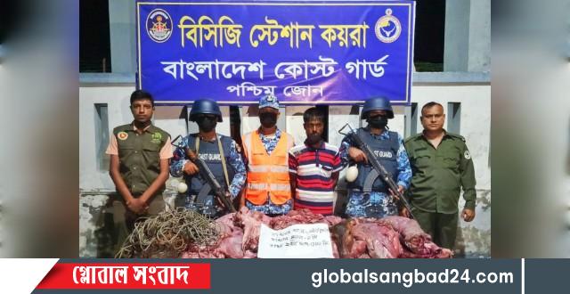 খু লনার কয়রায় প্রায় ১০৩ কেজি হরিণের মাংস, মাথা এবং হরিণ শিকারের ফাঁদসহ ১ জন হরিণ শিকারিকে আটক করেছে কোস্ট গার্ড।