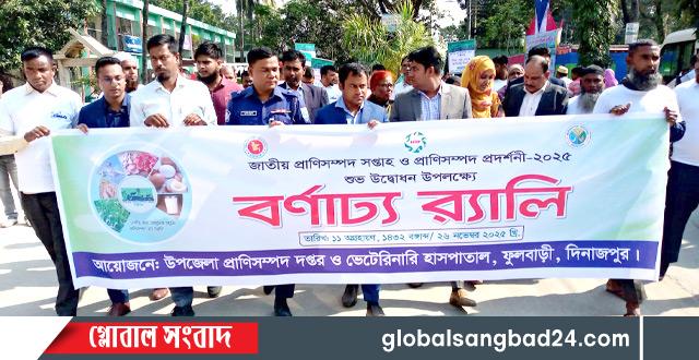 দে শীয় জাত আধুনিক প্রযুক্তি প্রানীসম্পদে হবে উন্নতি এই প্রতিপাদ্যকে সামনে রেখে দিনাজপুরের ফুলবাড়ীতে জাতীয় প্রাণীসম্পদ সপ্তাহ ও প্রানীসম্পদ প্রদর্শনী ২০২৫-উদযাপন উপলক্ষ্যে বর্ণাঢ্য র‌্যালী।