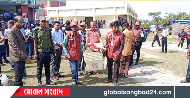 ভোট কেন্দ্রের প্রিজাইডিং কর্মকর্তাদের হাতে ব্যালট বাক্স, সিল ও অন্যান্য প্রয়োজনীয় নির্বাচনি সামগ্রী হস্তান্তর করা হচ্ছে। নৌবাহিনী, র্যাব পুলিশ ও আনসার সদস্যদের কঠোর পাহারায় সরঞ্জামগুলো নির্ধারিত ভোটকেন্দ্রে পৌঁছে দেওয়া হচ্ছে।