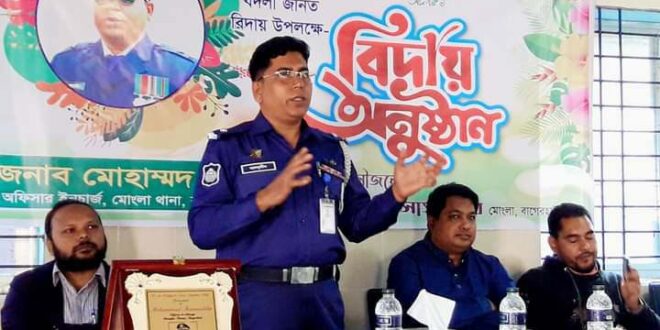 মোংলা থানার অফিসার ইনচার্জ (ওসি) মোহাম্মদ শামসুদ্দীন’র বদলিজনিত এক বিদায় সংবর্ধনা অনুষ্ঠিত হয়েছে। মোংলা অফিসার্স ক্লাবের আয়োজনে এ বিদায় সংবর্ধনা দেয়া হয়েছে।