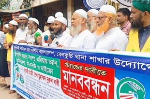 বেলকুচির মুকুন্দগাঁতী বাজারে ভ্যান–অটোরিকশা সিএনজি ও মাইক্রো স্ট্যান্ডের দাবীতে ইসলামী শ্রমিক আন্দোলনের মানববন্ধন