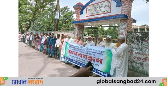 সোমবার সকাল ১০টায় বিদ্যালয়ের সামনে ঘণ্টাব্যাপী অনুষ্ঠিত মানববন্ধনে শিক্ষার্থীদের অভিভাবক ও স্থানীয়রা অংশ গ্রহণ করেছেন। এ সময় তারা বিদ্যালয়ের প্রধান শিক্ষক জয়নাল আবেদীন ও সভাপতি মো. মিজানুর রহমানের বিরুদ্ধে নিয়োগ বাণিজ্য, অর্থ আত্মসাত, নির্মাণাধীন বিদ্যালয়ের ভবনের ঠিকাদার থেকে উৎকোচ গ্রহণসহ নানাবিধ অভিযোগ তুলে ধরেন।