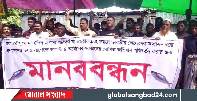 মা ইলিশ সংরক্ষণ অভিযানের সময় পরিবর্তনের ( পিছানোর) দাবিতে শুক্রবার (২৬ সেপ্টেম্বর )সকালে নোয়াখালীর হাতিয়া উপজেলার কাজির বাজার ঘাটে মানববন্ধন ও বিক্ষোভ মিছিল করেছে স্থানীয় জেলে ও মৎস্য ব্যবসায়ীরা।