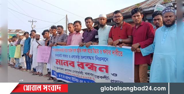 নো য়াখালী সুবর্ণচরে দখলকৃত খাল পুনরুদ্ধার ও জলবদ্ধতা নিরসনে খাল খননের দাবীতে মানববন্ধন ও প্রতিবাদ সমাবেশ করেছে ৪ নং চর ওয়াপদা ইউনিয়নের ক্ষতিগ্রস্ত শত শত এলাকাবাসী।
