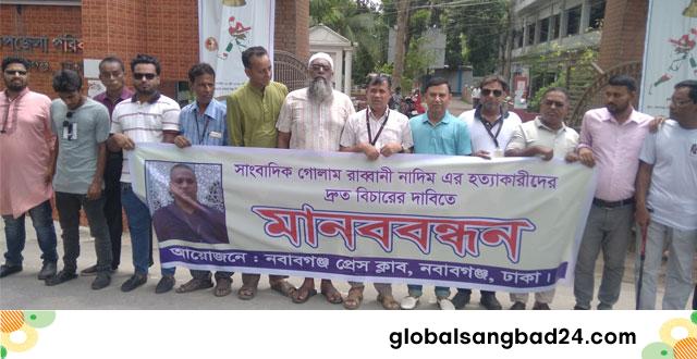 বাংলানিউজের জামালপুর ড্রিস্ট্রিক্ট করেসপন্ডেন্ট গোলাম রাব্বানী নাদিমের হত্যাকারীদের দ্রুত বিচারের দাবিতে ঢাকার নবাবগঞ্জ উপজেলা প্রেসক্লাবের পক্ষ থেকে মানববন্ধন করা হয়েছে।সোমবার ( ১৯ জুন ) সকাল সাড়ে ১০ টার দিকে উপজেলা পরিষদ কার্যালয়ের সামনে ঢাকা বান্দুরা সড়কে নবাবগঞ্জ প্রেসক্লাবের উদ্যোগে এ মানববন্ধন করা হয় ।