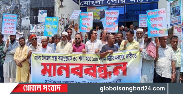 যে কোন সময়ে পুরনো ভবন ভেঙ্গে পড়তে পারে। তাই হাসপাতালের নতুন ভবন নির্মানের দাবি জানাই। মানববন্ধন ও সমাবেশে বক্তারা মোংলা উপজেলা স্বাস্থ্য কমপ্লেক্স এর অপারেশন কার্যক্রম সব সময় চালু রাখার জন্য জরুরি ভিত্তিতে গাইনী ও এনেসথেসিয়া বিশেষজ্ঞ পদায়নের জোর দাবি জানায়।