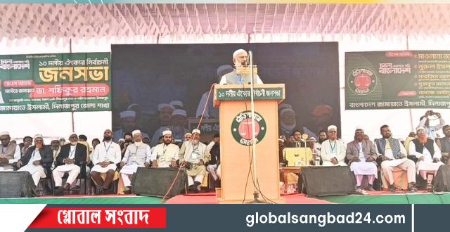 ডা.শফিকুর রহমান নির্বাচনী জনসভায় তাঁর বক্তব্যে বলেন এক সাগর রক্তের বিনিময়ে জুলাই না হলে আজ আমরা দিনাজপুর গোর এ শহীদ ময়দানে এসে কথা বলতে পারতাম না বাংলাদেশ জামায়াতে ইসলামী মানুষ ঠকানোকে বিশ্বাসী নয় আমরা চাঁদা নেব না আর কাউকে চাঁদা নিতে দেব না নিজেরা দুর্নীতি করব না আর কাউকে দুর্নীতি করতেও দেব না।