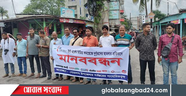 ঢাকার ইস্ট ওয়েস্ট মিডিয়া কমপ্লেক্সেসহ দেশের বিভিন্ন স্হানে গণমাধ্যম অফিসে দুর্বৃত্তদের হামলা, ভাঙচুর ও সাংবাদিক নির্যাতনের প্রতিবাদে রাজবাড়ীর গোয়ালন্দে মানববন্ধন ও প্রতিবাদ কর্মসূচি পালন করেছেন গণমাধ্যম কর্মীরা।