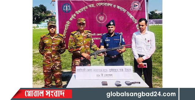 শনিবার (৭ সেপ্টেম্বর) দুপুরে নরসিংদী স্টেডিয়ামে এক সংবাদ সম্মেলনের মাধ্যমে নরসিংদী সেনা ক্যাম্পের অধিনায়ক লে: কর্ণেল মো. ফাহিম মাহবুব, নির্বাহী ম্যাজিস্ট্রেট সারোয়ার আলম এর উপস্থিতে নরসিংদী সদর থানার ভারপ্রাপ্ত কর্মকর্তা তানভীর আহমেদের কাছে এসব অস্ত্র-শস্ত্র হস্তান্তর করেন।
