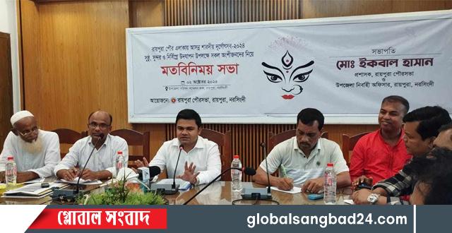 এসময় পৌর প্রশাসকের দায়িত্বে থাকা উপজেলা নির্বাহী কর্মকর্তা মো. ইকবাল হাসান, রায়পুরায় হিন্দুধর্মালম্বীদের সবচেয়ে বড় উৎসব শারদীয় দূর্গা পূজাকে সুষ্ঠু ও শান্তিপূর্ণ ভাবে পালনের ক্ষেত্রে সকলের সহযোগিতার আহবান জানান।