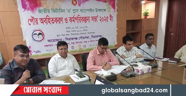 সিরাজগঞ্জ পৌরসভায় জাতীয় ভিটামিন “এ” প্লাস ক্যাম্পেইন অবহিত করণ ও কর্মপরিকল্পনা সভা অনুষ্ঠিত হয়। সিরাজগঞ্জ পৌরসভার ১৫ টি ওয়ার্ডে ১০০ টি কেন্দ্রের মাধ্যমে শিশুদের অপুষ্টিজনিত, অন্ধত্ব প্রতিরোধ, মৃত্যু ঝুঁকি, প্রতিরোধ সহ এই ক্যাম্পেইন সভা অনুষ্ঠিত হয়েছে। শিশুদের অপুষ্টি জনিত অন্ধত্ব প্রতিরোধ, ও শিশু মৃত্যুর ঝুঁকি কমানোর লক্ষ্যে, দেশব্যাপী আগামী ১৫ই মার্চ ২০২৫ শনিবার জাতীয় ভিটামিন “এ” প্লাস ক্যাম্পেইন অনুষ্ঠিত হবে।