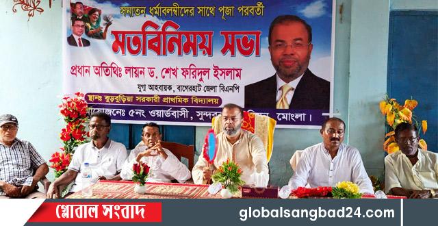 মোংলায় সনাতন ধর্মাবলম্বীদের সাথে পূজা পরবর্তী মতবিনিময় সভা করেছে বিএনপি। শুক্রবার বিকেলে উপজেলার সুন্দরবন ইউনিয়নের বুড়বুড়িয়া এলাকার বুড়বুড়িয়া সরকারী প্রাথমিক বিদ্যালয় চত্বরে স্থানীয় বিএনপি আয়োজিত এ সভায় প্রধান অতিথি হিসেবে উপস্থিত ছিলেন মোংলা-রামপাল (বাগেরহাট) সংসদীয় আসনের মনোনয়ন প্রত্যাশী বাগেরহাট জেলা বিএনপির যুগ্ম আহবায়ক লায়ন ডক্টর শেখ ফরিদুল ইসলাম।