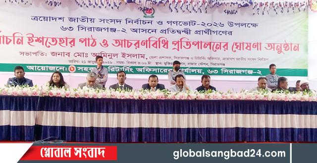 আ সন্ন ত্রয়োদশ জাতীয় সংসদ নির্বাচন ও গনভোট ২০২৬ উপলক্ষে ৬৩ সিরাজগঞ্জ-২ আসনে প্রতিদ্বন্দ্বী প্রার্থীগণের নির্বাচনী ইশতেহার পাঠ ও আচরণবিধি প্রতিপালনের ঘোষণা অনুষ্ঠান অনুষ্ঠিত।