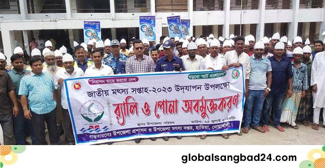 নোয়াখালীর দ্বীপ উপজেলা হাতিয়ায় “নিরাপদ মাছে ভরবো” দেশ গড়বো স্মার্ট বাংলাদেশ” এই প্রতিপাদ্যকে সামনে রেখে জাতীয় মৎস্য সপ্তাহ ২০২৩ পালিত হয়েছে।আজ মঙ্গলবার (২৫ জুলাই) সকালে উপজেলা মৎস্য অধিদপ্তরের আয়োজনে একটি বর্ণাঢ্য র্যালী উপজেলার প্রধান প্রধান সড়ক প্রদক্ষিণ শেষে উপজেলা পরিষদের সামনে এসে শেষ হয়।