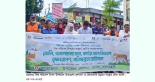 ॥ মাসুদ রানা, বাগেরহাট জেলা প্রতিনিধি ॥ মোং লায় প্লাস্টিক-পলিথিন দূষণরোধে সচেতনতা সৃষ্টিতে পাটের পলিথিন বিতরণ, পরিচ্ছন্নতা অভিযান, র্যালি, বৃক্ষরোপণ ও আলোচনা সভা অনুষ্ঠিত হয়। ২৫ জুন বুধবার সকালে উপজেলা পরিষদ চত্বরে বিশ্ব পরিবেশ উপলক্ষে উপজেলা প্রশাসনের আয়োজনে এসব কর্মসূচি পালন করা হয়। সুন্দরবন-নদ-নদী-প্রাণ-প্রকৃতি বাঁচাতে এখনই প্লাস্টিক-পলিথিন দূষণকে …