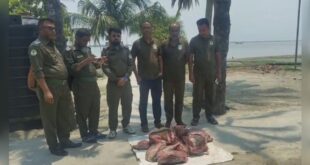 ॥ মাসুদ রানা, বাগেরহাট জেলা প্রতিনিধি ॥ সু ন্দরবনের হুলার ভারানী খাল থেকে ৪২ কেজি হরিণের মাংস জব্দ করেছে বনবিভাগ। এ সময় ৪ চোরা শিকারী পালিয়ে যায়। এ ঘটনায় পলাতকদের বিরুদ্ধে বন আইনে মামলা দায়ের হয়েছে। এ সময় বনপ্রহরীদের উপস্থিতি টের পেয়ে চোরা শিকারীরা বনের গহীনে পালিয়ে যায়। …