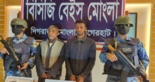 ॥ মাসুদ রানা, বাগেরহাট জেলা প্রতিনিধি ॥ অপারেশন ডেভিল হান্টে কোস্ট গার্ড, নৌবাহিনী ও পুলিশের যৌথ অভিযানে সাতক্ষীরার শ্যামনগরের চকবারা বাজার এলাকা হতে আব্দুল হাকিম গাজি (৬৮) ও তার ছেলে মোঃ হাফিজুর রহমান গাজি (২৫) আটক হয়েছে। এদিকে রবিবার রাতে মোংলা উপজেলার চাঁদপাই ইউনিয়নের চাঁদপাই এলাকা থেকে আওয়ামী লীগের তিন …